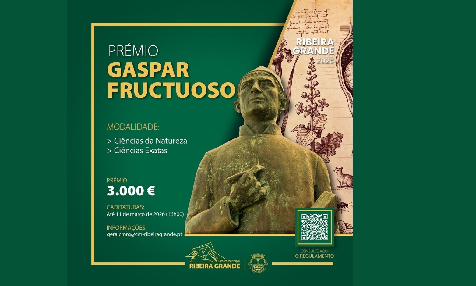 A Câmara Municipal da Ribeira Grande volta a promover, em 2026, mais uma edição do prémio “Gaspar Fructuoso” que visa galardoar o autor, ou autores, da melhor investigação ou obra literária que contribua para a valorização, dignificação, engrandecimento e projeção da cidade e do concelho da Ribeira Grande.