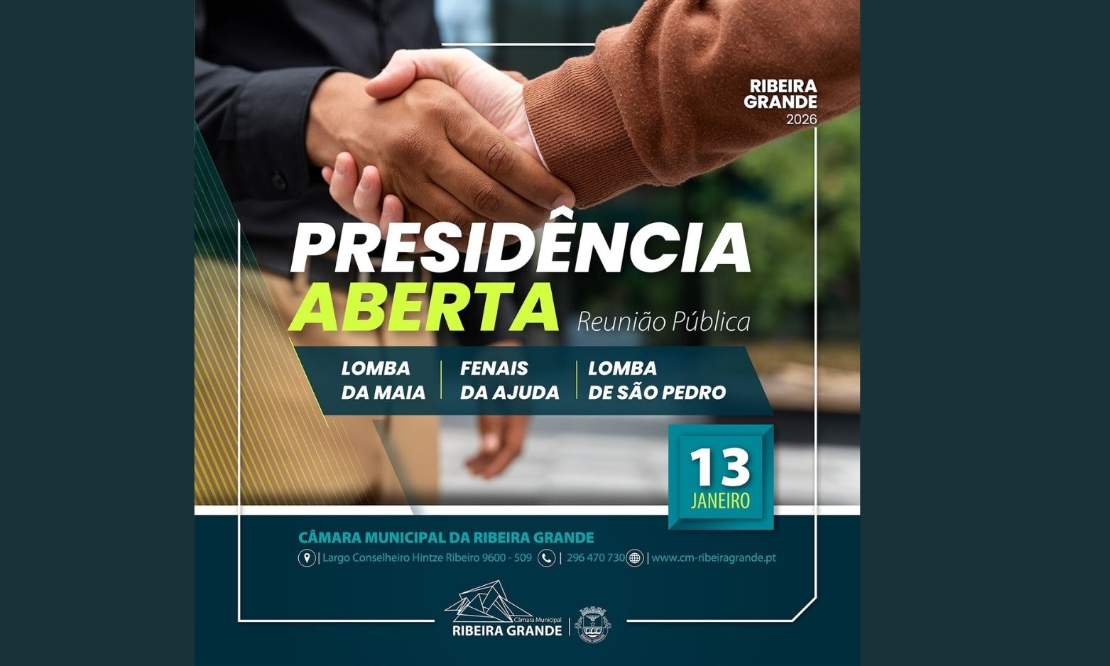 O executivo camarário da Ribeira Grande vai lançar, no próximo dia 13 de janeiro de 2026 (terça-feira), a iniciativa “Presidência Aberta”, um novo projeto que pretende reforçar a proximidade entre a autarquia, as instituições locais e os munícipes das 14 freguesias do concelho.